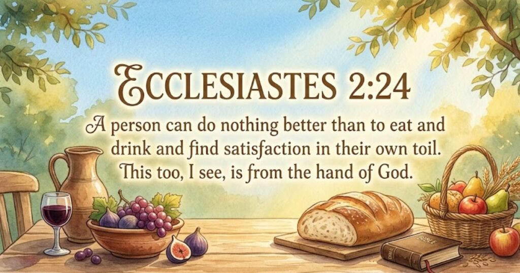 Ecclesiastes 2:24 gives divine permission to enjoy food. Solomon declares that eating, drinking, and finding satisfaction in work is genuinely good. This verse counters false spiritual guilt around enjoying meals. God designed pleasure in food as a legitimate gift worth receiving with gratitude and without unnecessary shame or hesitation.